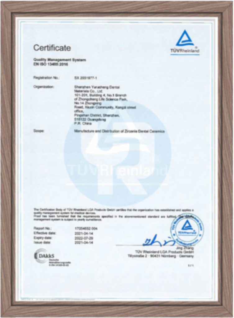 Yurucheng obtained the EU CE certification and ISO 13485 system certification for Zirconia Dental Ceramics.